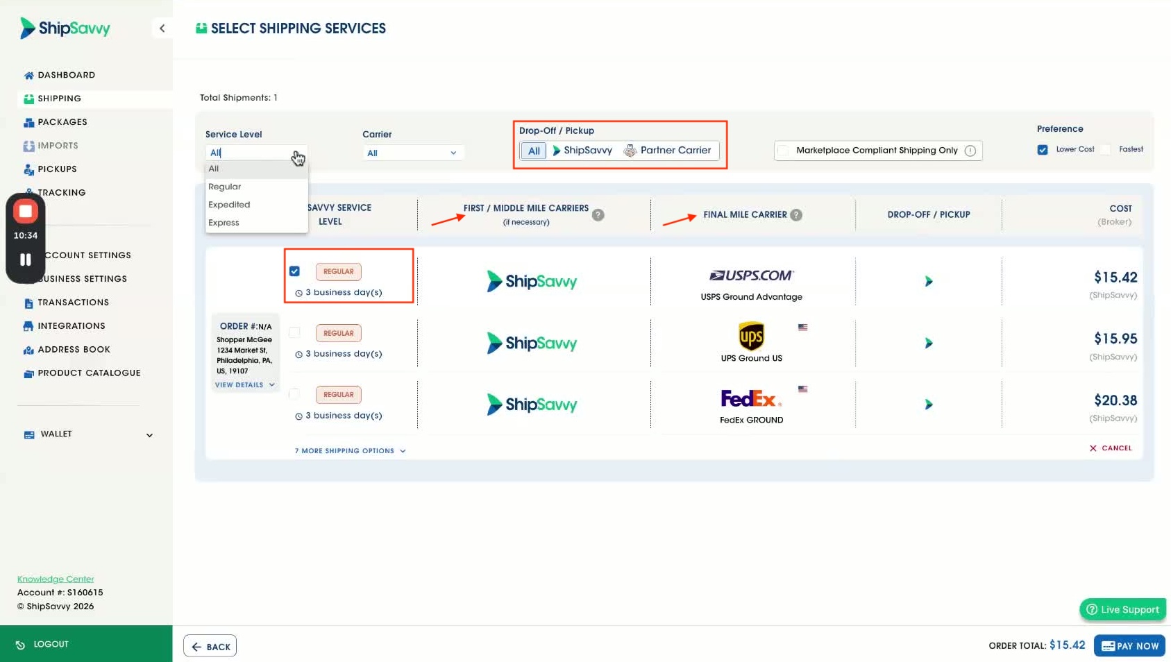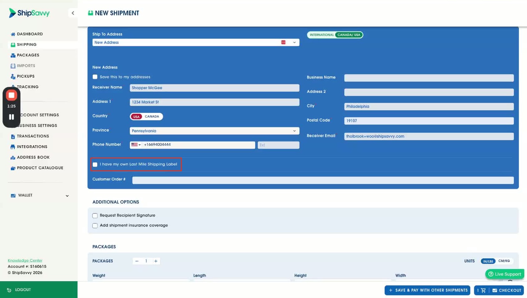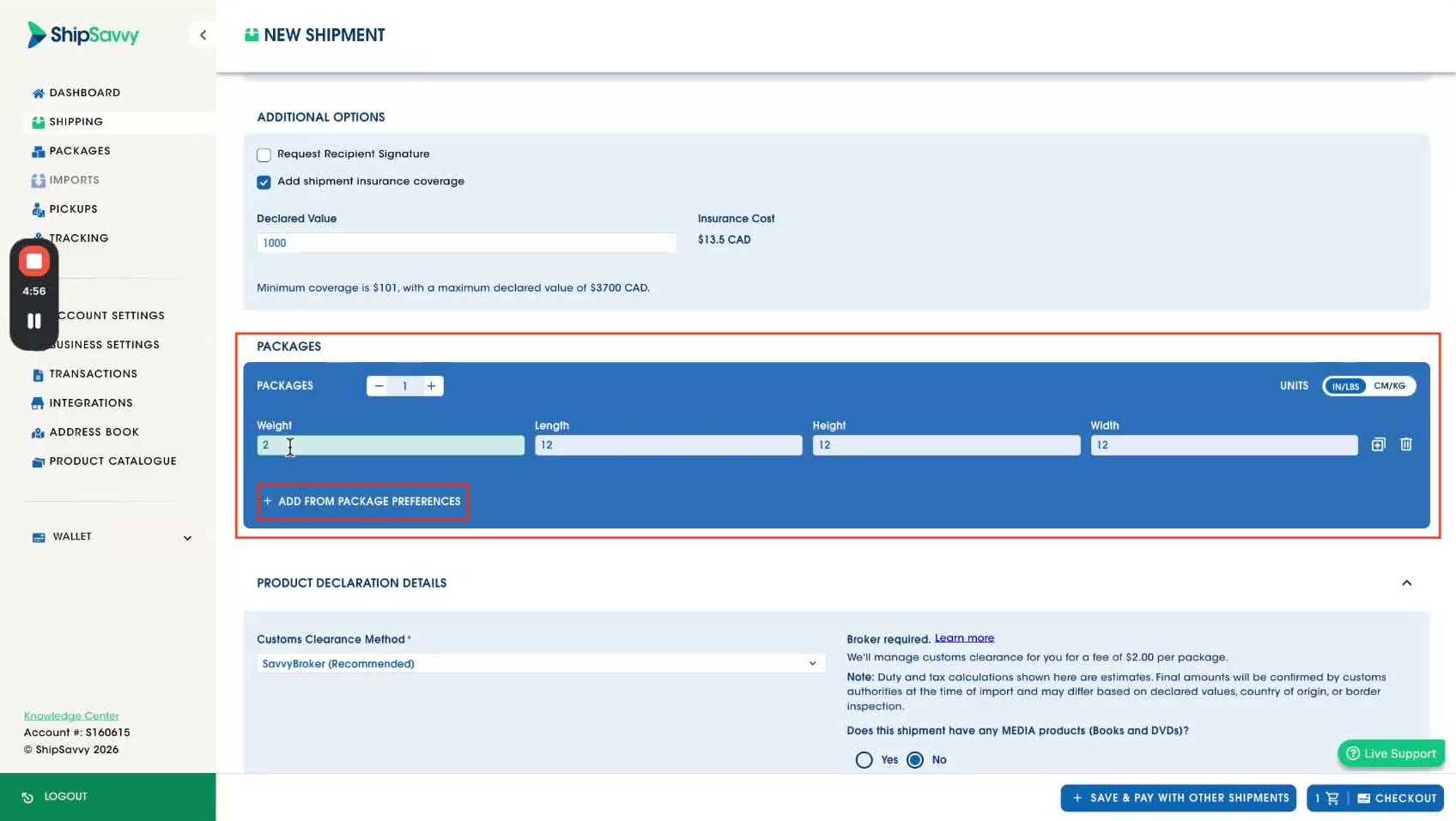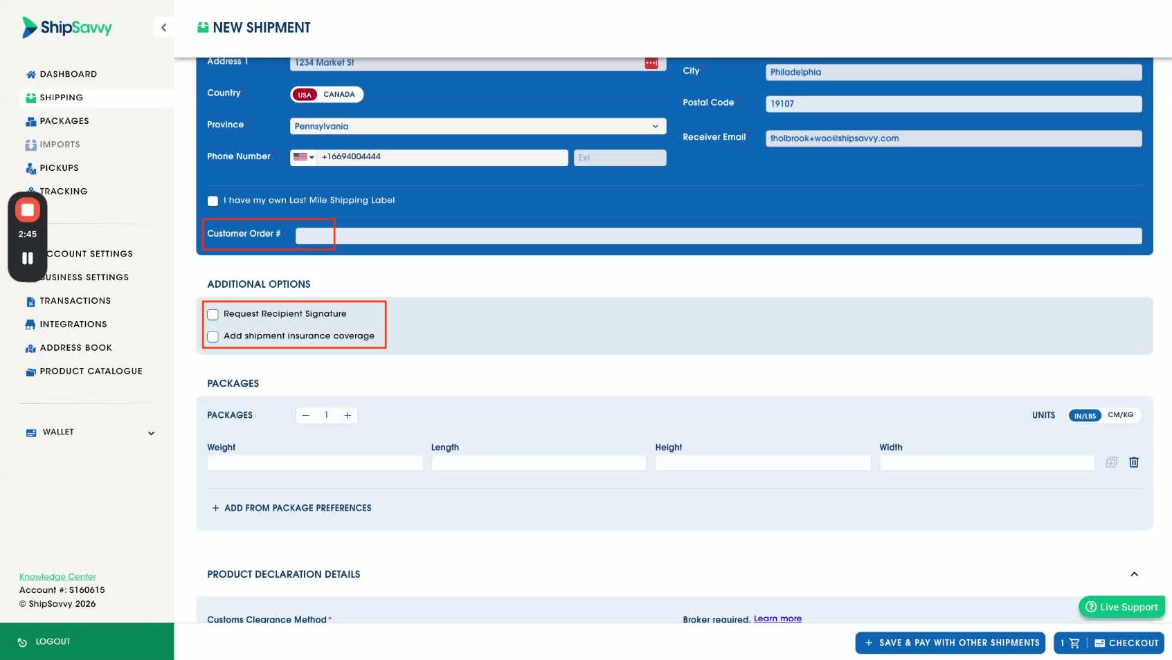 Creating a new shipment in ShipSavvy is straightforward: enter the Ship From and Ship To details, add your package information, then either Save & Pay Later or proceed directly to Checkout. For U.S.-bound shipments, you’ll also need to complete a product declaration and select a customs clearance method. ShipSavvy now automatically shows the best pickup and drop-off options based on your ship-from location, making it easier to compare not just carrier rates and service levels, but also delivery-to-carrier methods. This helps you choose the fastest option for urgent shipments or the most cost-effective pickup option for less time-sensitive orders.