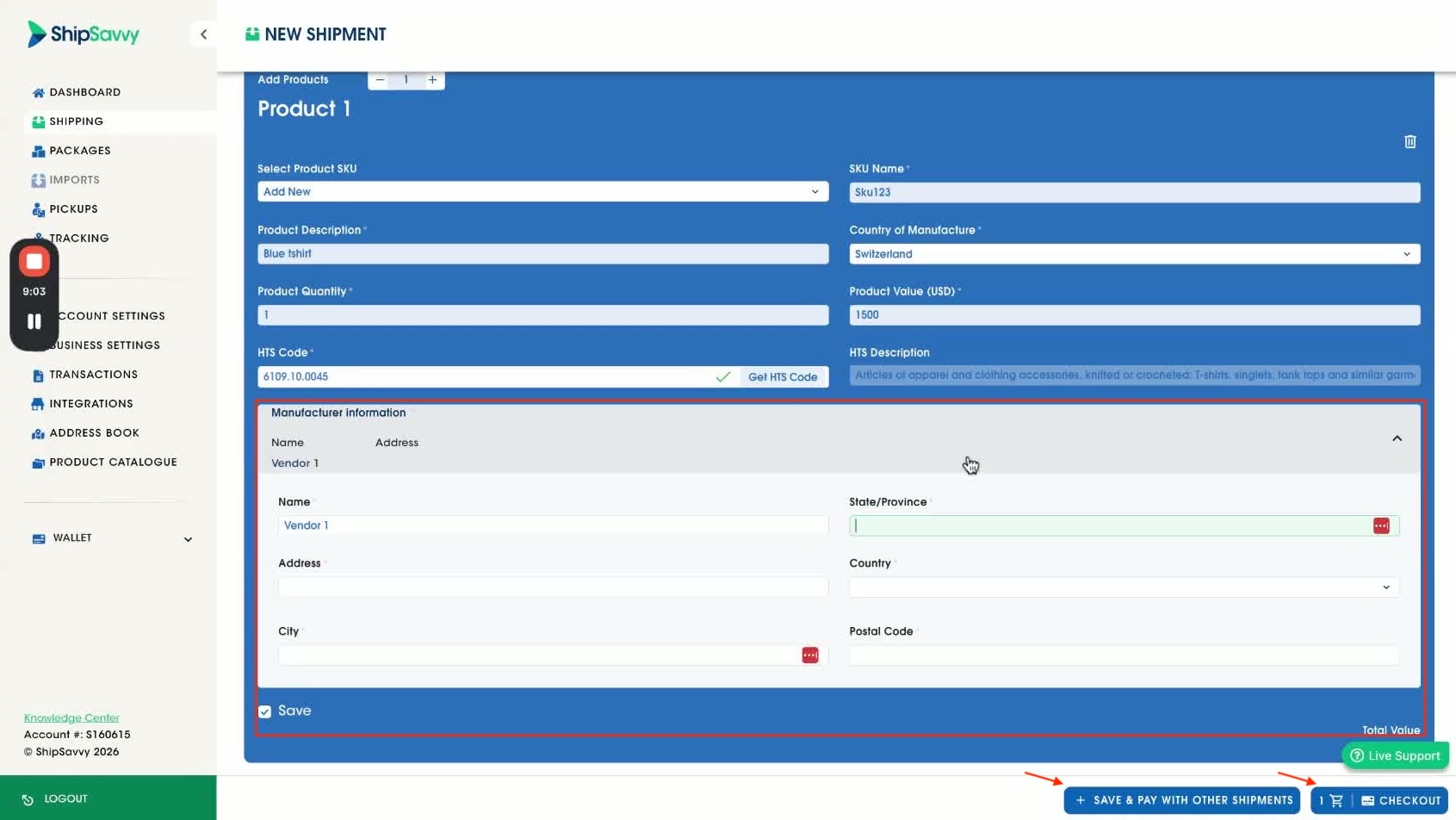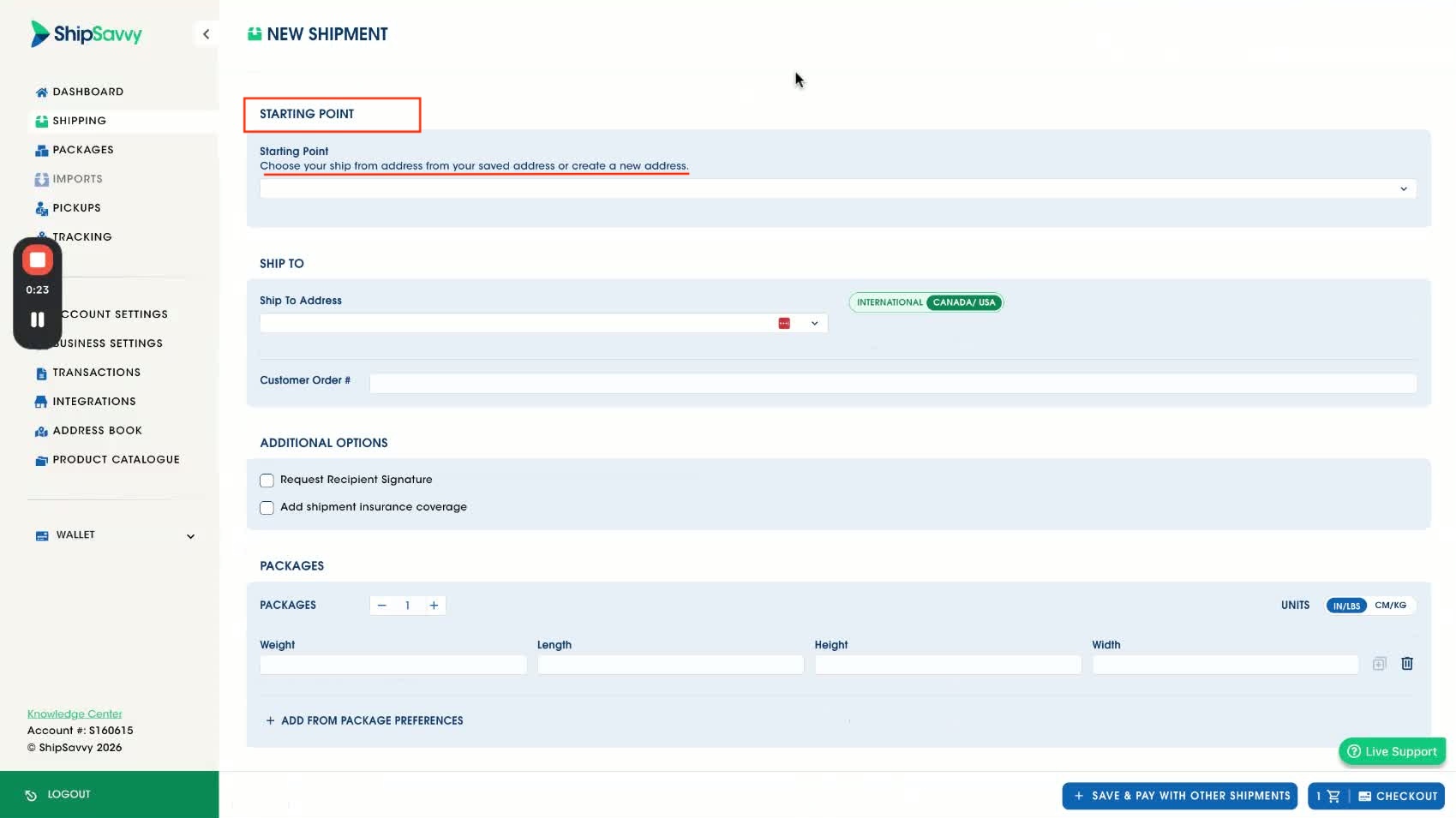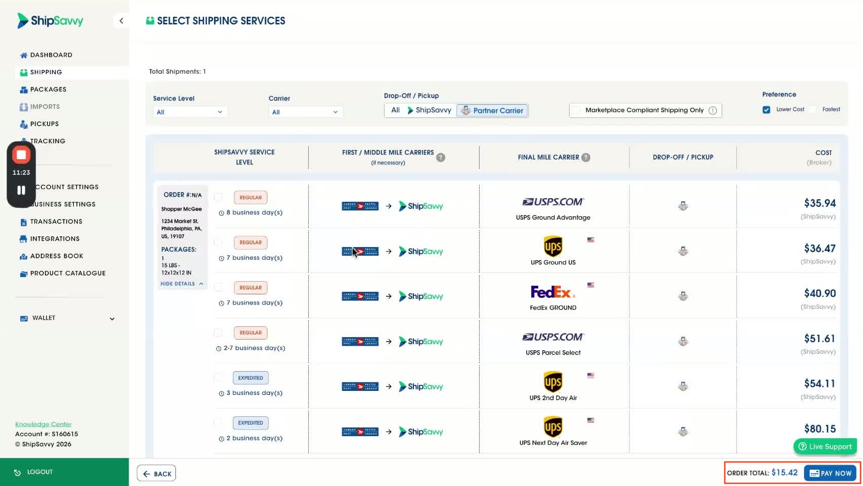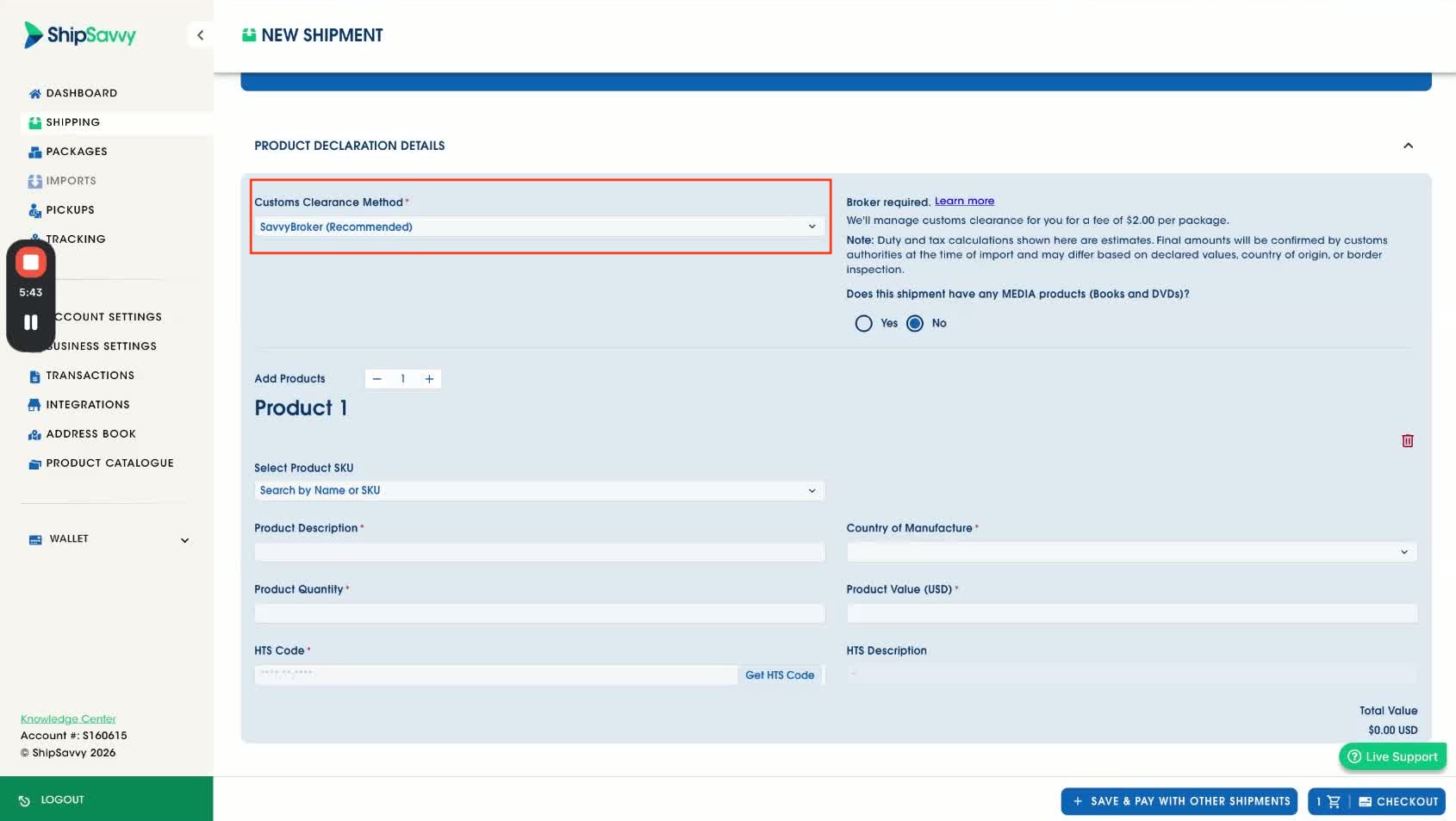Creating a new shipment in ShipSavvy is straightforward: enter the Ship From and Ship To details, add your package information, then either Save & Pay Later or proceed directly to Checkout. For U.S.-bound shipments, you’ll also need to complete a product declaration and select a customs clearance method. ShipSavvy now automatically shows the best pickup and drop-off options based on your ship-from location, making it easier to compare not just carrier rates and service levels, but also delivery-to-carrier methods. This helps you choose the fastest option for urgent shipments or the most cost-effective pickup option for less time-sensitive orders.