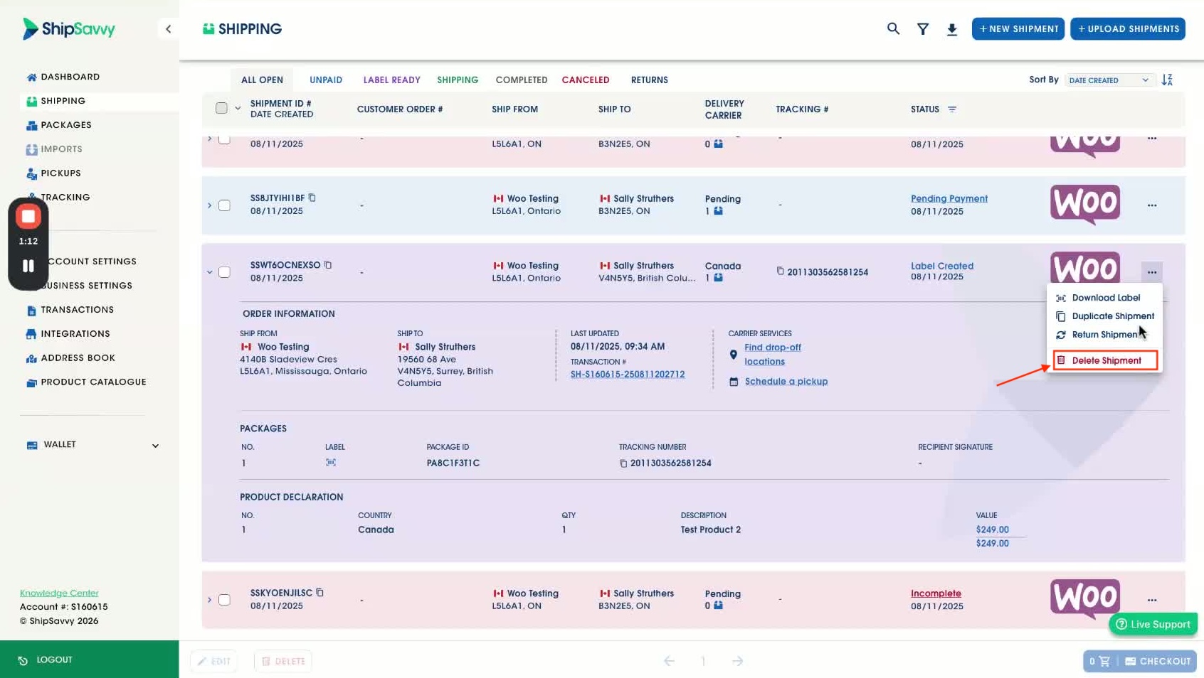 4. Choose to Delete the Shipment - From the options menu, select 'Delete Shipment'. Be aware that some shipments may incur cancellation fees.