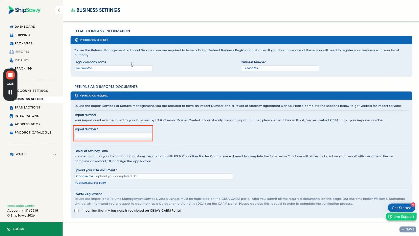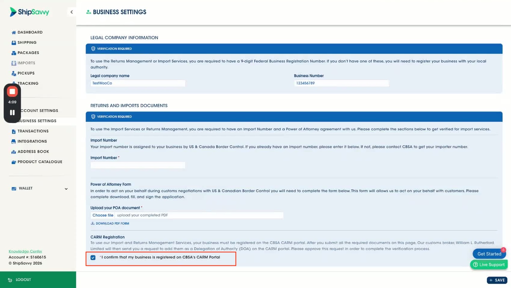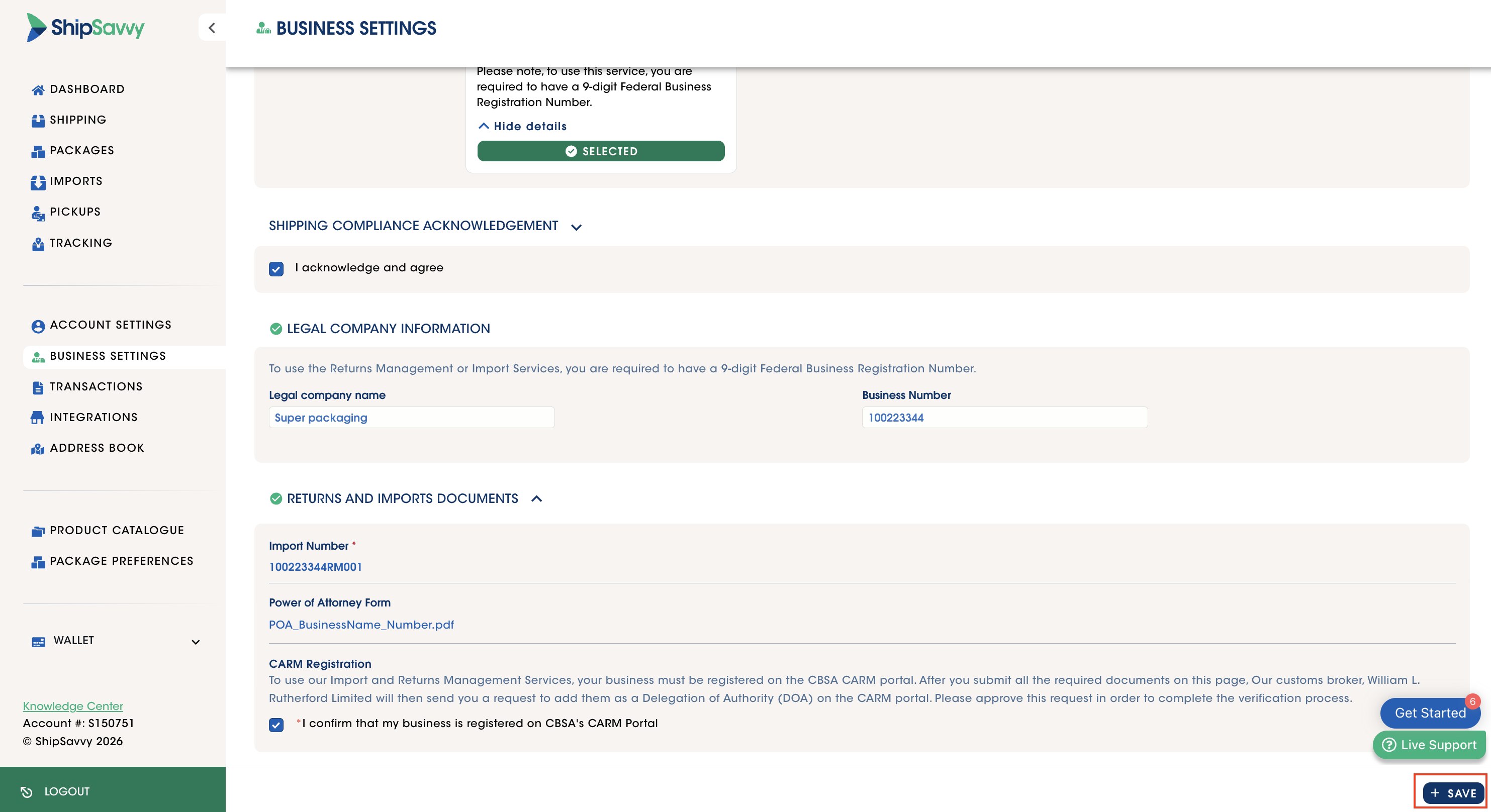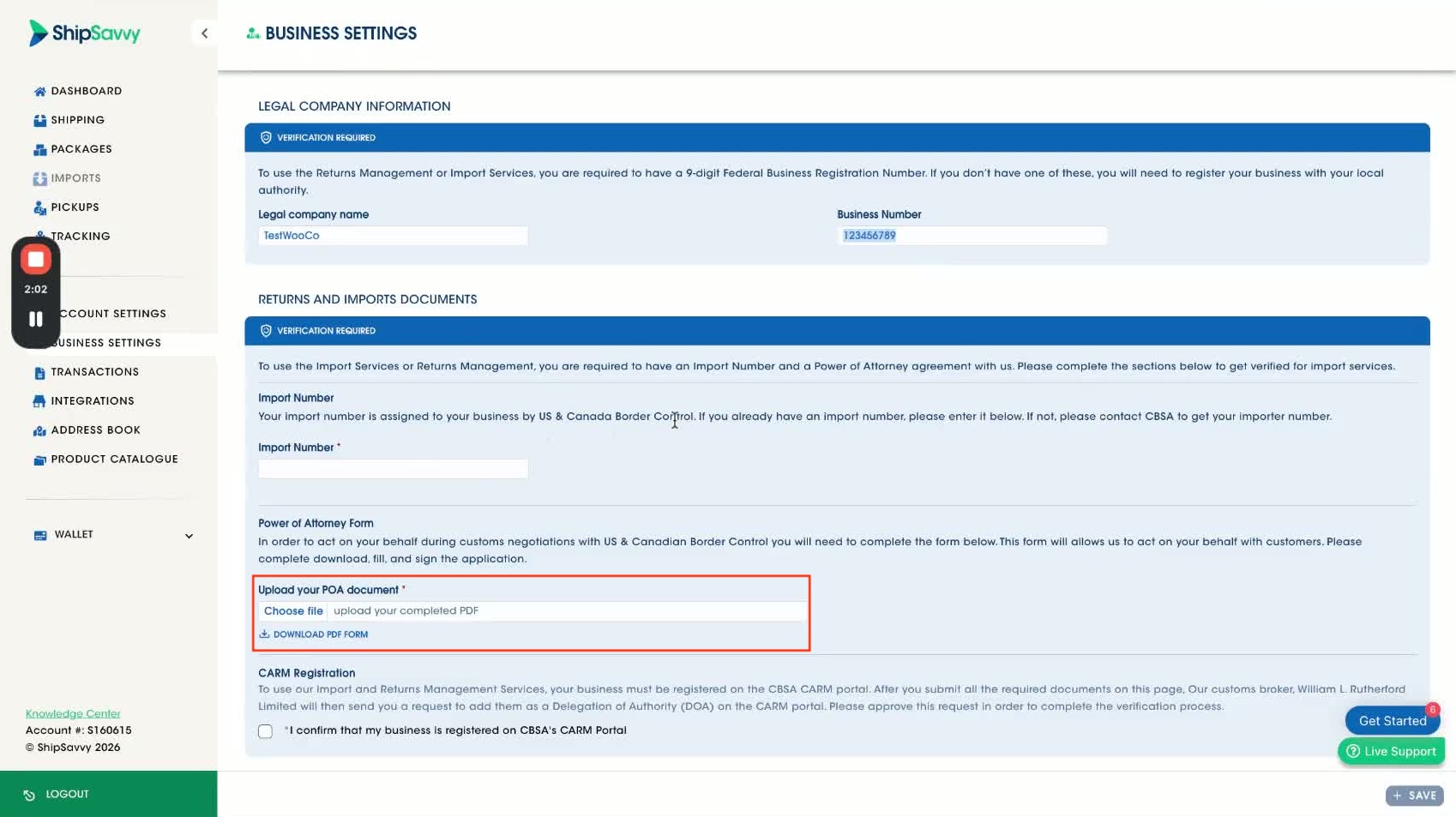 4. Power of Attorney: For us to act on your behalf during customs negotiations with US & Canadian Border Control, you'll need to download the Power of Attorney (POA) form provided in the Business Settings. This form allows us to represent you during customs processes. Fill out the POA with your details and once completed, upload the form.