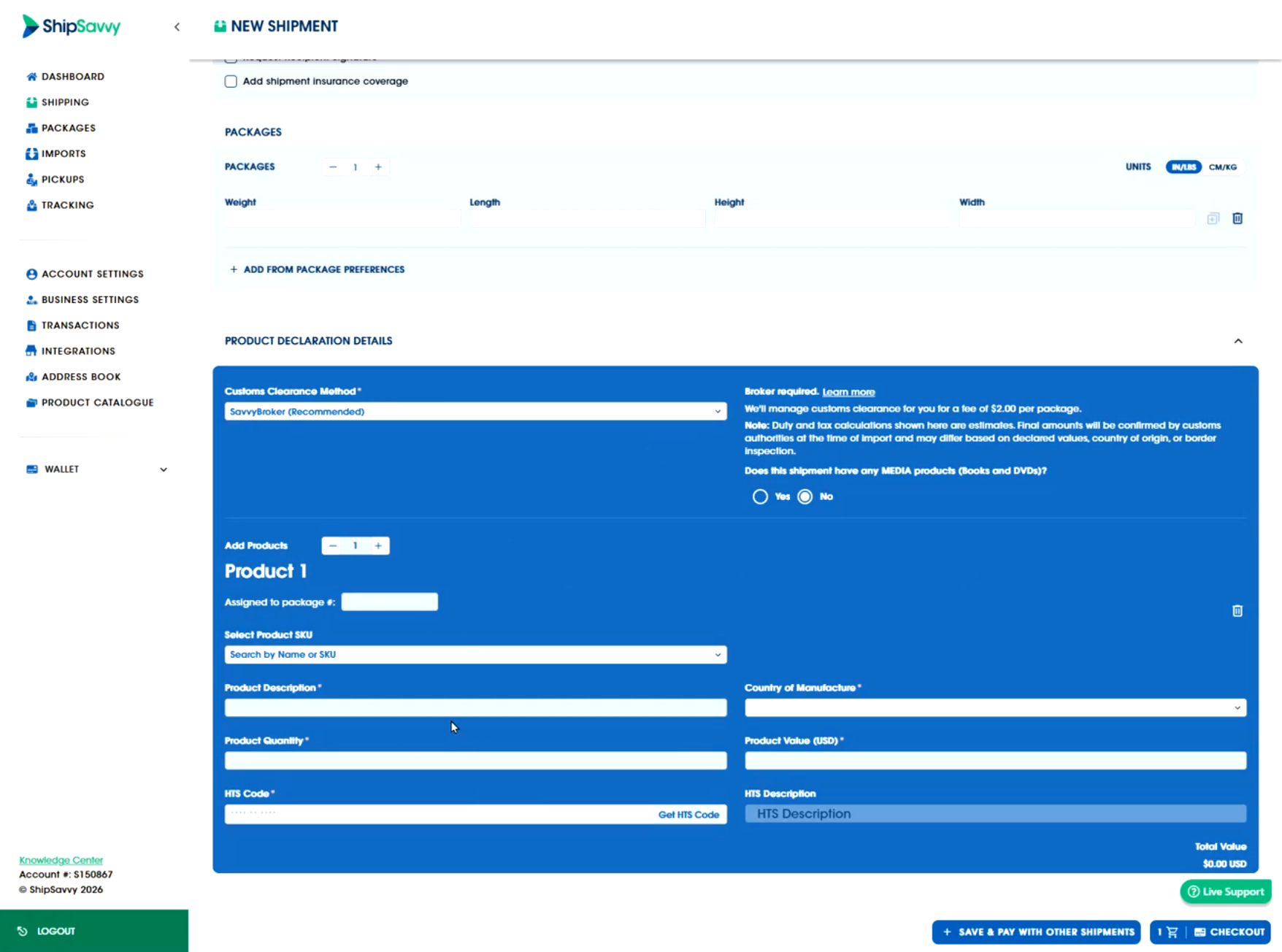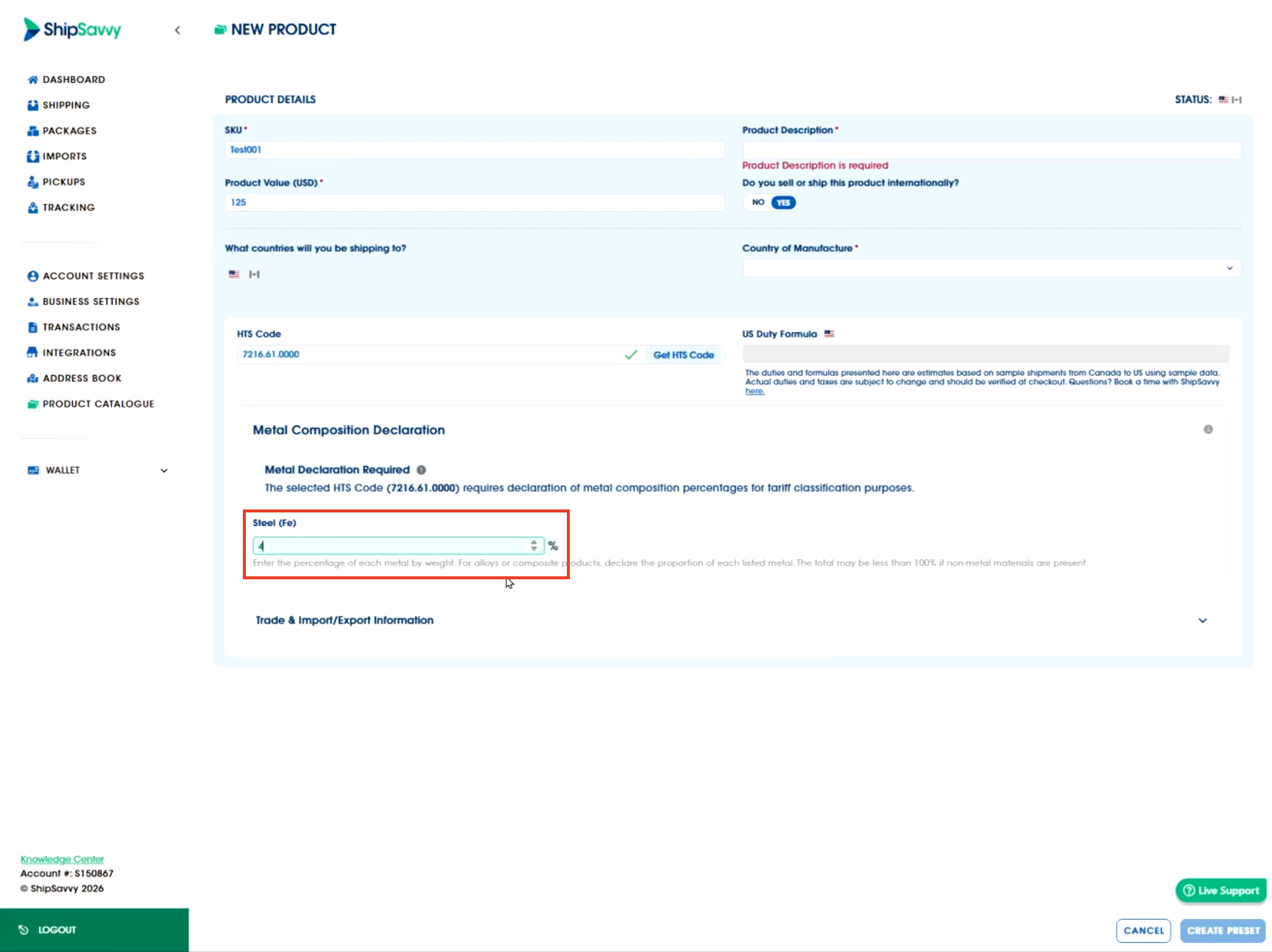 We’ve added support for Metal HTS Code percentages so customers can declare the metal composition of certain products (when required) to help calculate duties more accurately.