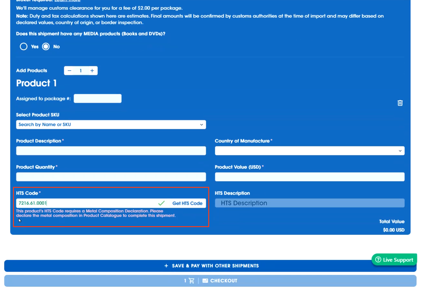 Note: If the platform requests metal composition for that HTS code, the product can’t be saved until the declaration is completed.