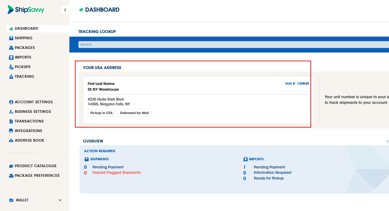 We will provide you with your own unique unit number at our US facility to use when placing orders with US retailers or for your returns. This address will be available on your Dashboard when logged into your ShipSavvy customer portal. Please use this address when placing orders with US retailers. Please ensure that the name and unit number are provided when placing the order.