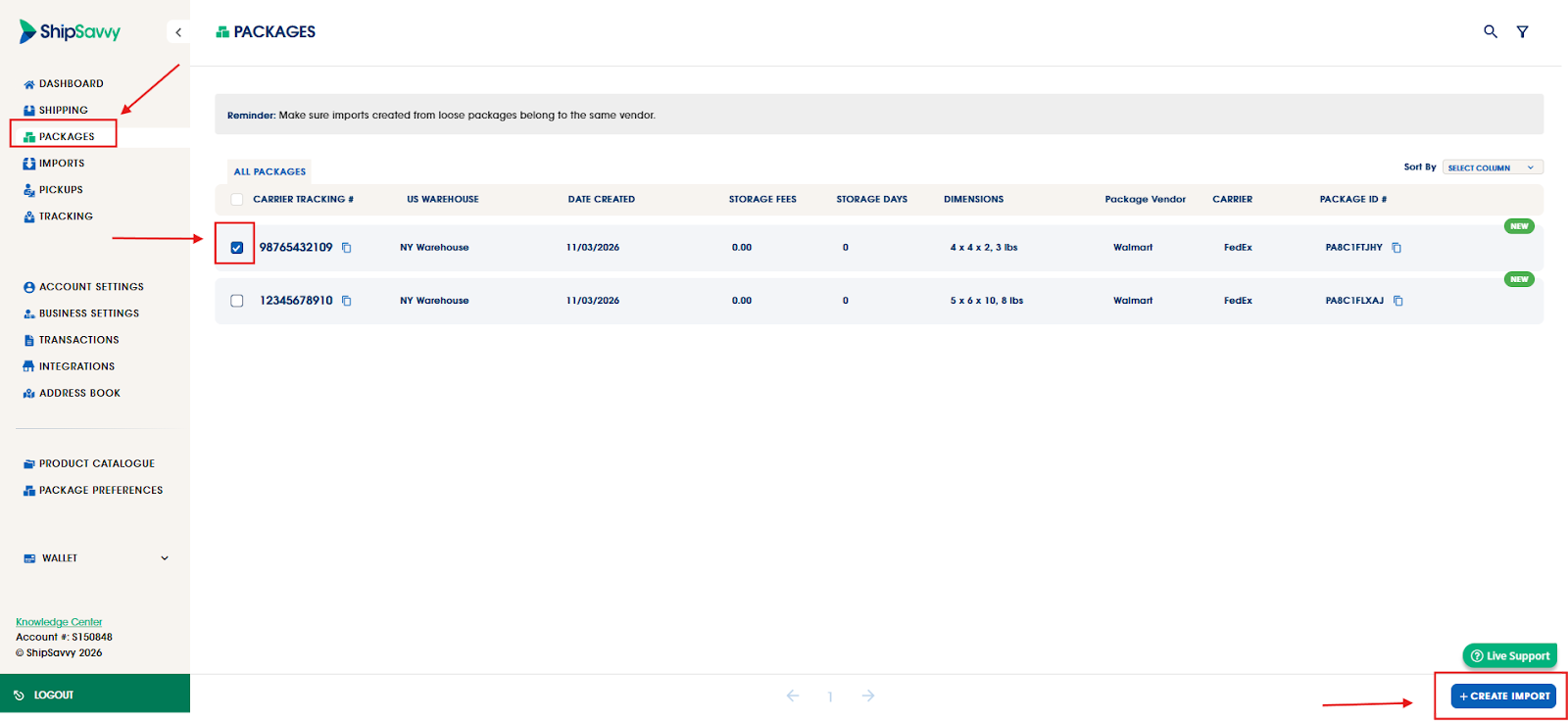 *For multiple packages from the same retailer/order, please select all packages first and then proceed to click on CREATE IMPORT.