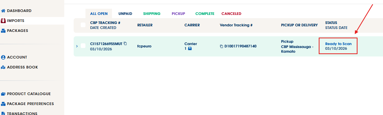 Now your order has been created, the status will be updated to reflect Ready to Scan/Ship, and will be transported to Canada to the retail location you selected for pickup, or mailed directly to you if you selected our delivery service. You can monitor the status of your order from the import tab. The import will reflect In-Transit from US to CA once on the way, and then Ready for Pickup once available for pickup at our retail location. If our delivery service is selected, the status will reflect Carrier In-Transit.