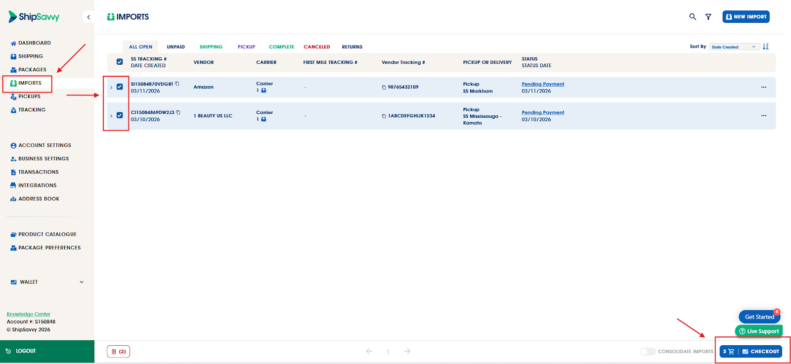 If you choose to save & pay with other imports, the import will be available under the Imports tab with the status reflecting pending payment. When you are ready to create the order, you can select all the pending payment imports and click on Checkout to create the order.