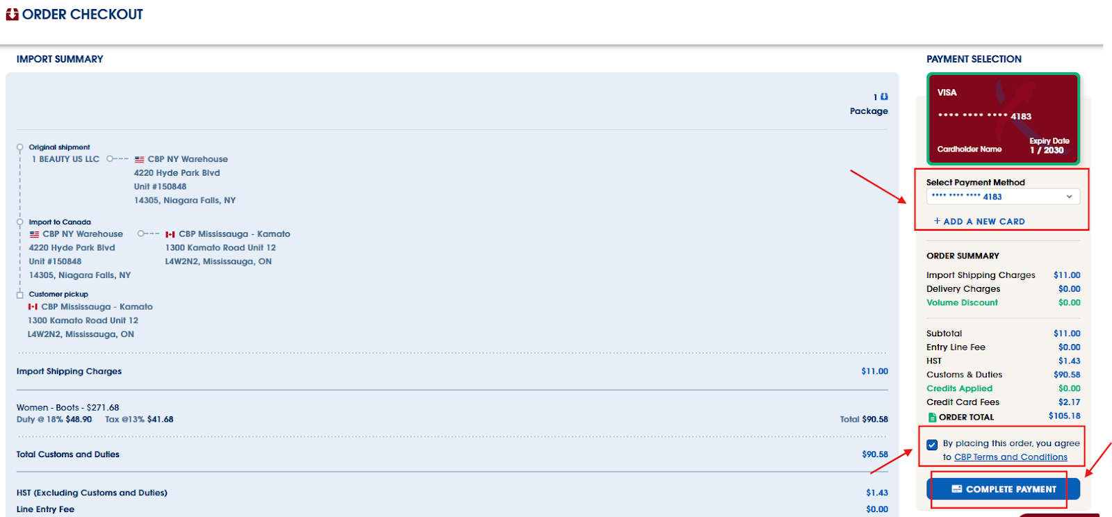 The last step is creating the order for your import. You can proceed to review pricing to view the full order total, including duties/taxes and delivery if our delivery service was selected. Or you may save and pay with other imports. If you selected our delivery service to have the package shipped directly to you, you will be provided with a few different carrier rate options to select from. You will then be able to add your credit card information, agree to our terms and conditions, and complete payment.